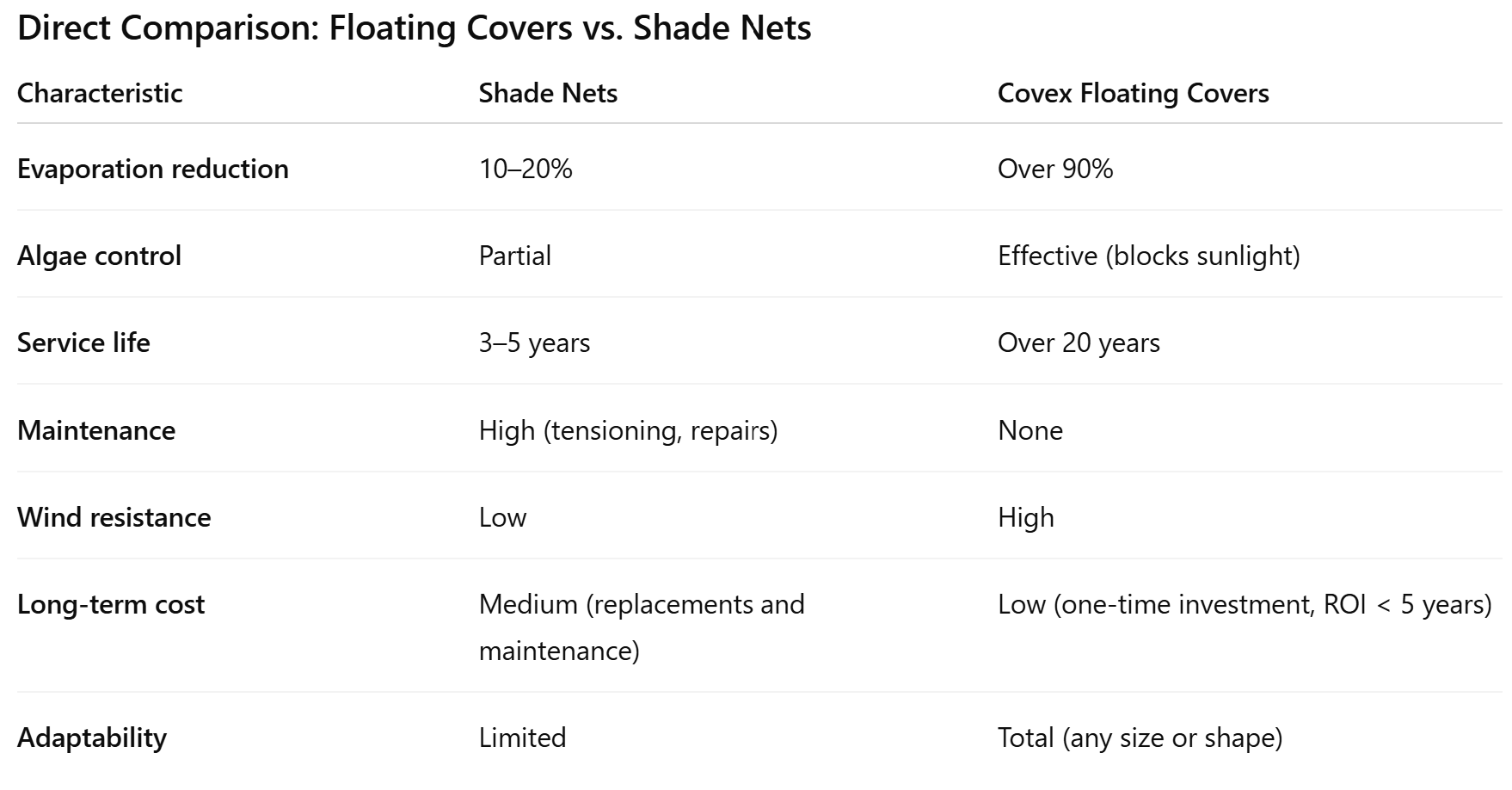 Les filets d'ombrage offrent une solution partielle et à court terme, tandis que les couvertures flottantes offrent l'efficacité, la durabilité et la viabilité - le choix intelligent pour la conservation de l'eau à long terme.